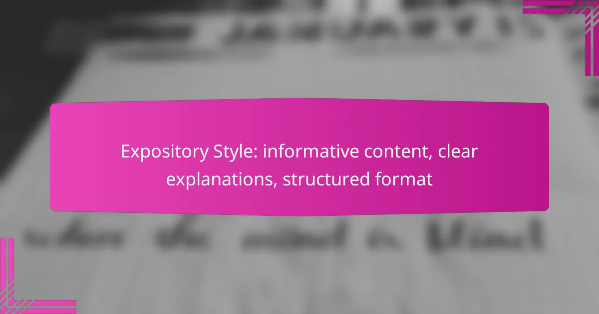 Expository style is characterized by clarity and straightforwardness, focusing on delivering information without personal bias. The key elements include an objective tone, fact-based information, and a defined audience, all of which work together to inform and educate effectively.